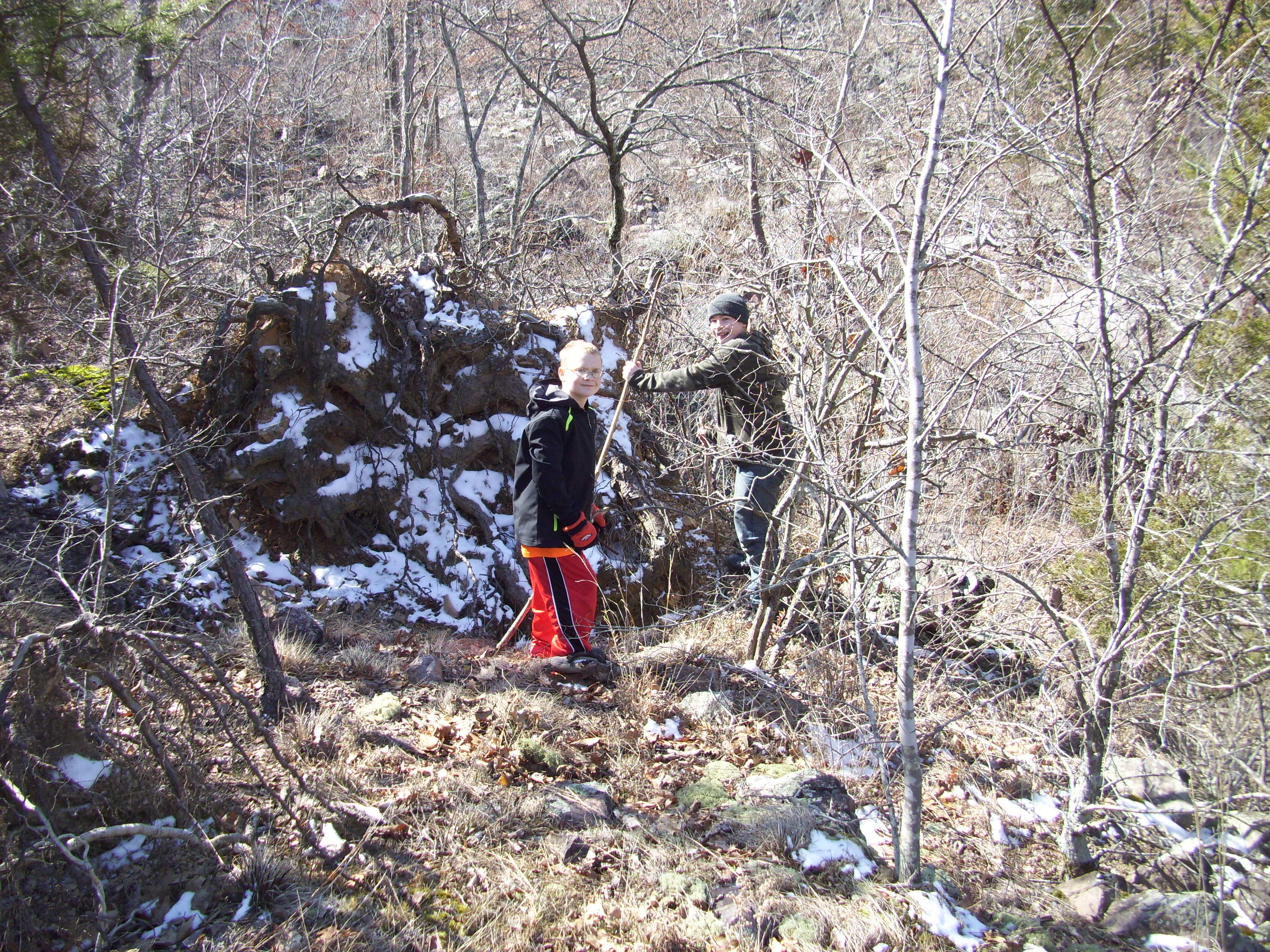We got to the end of the jeep path around noon on a cloudy Saturday. It was probably just at freezing, with snow falling intermittently throughout the hike to the creek. It’s about a mile and a half, after you cross the stream just beyond the gate at the parking area. Good spot to take a break!