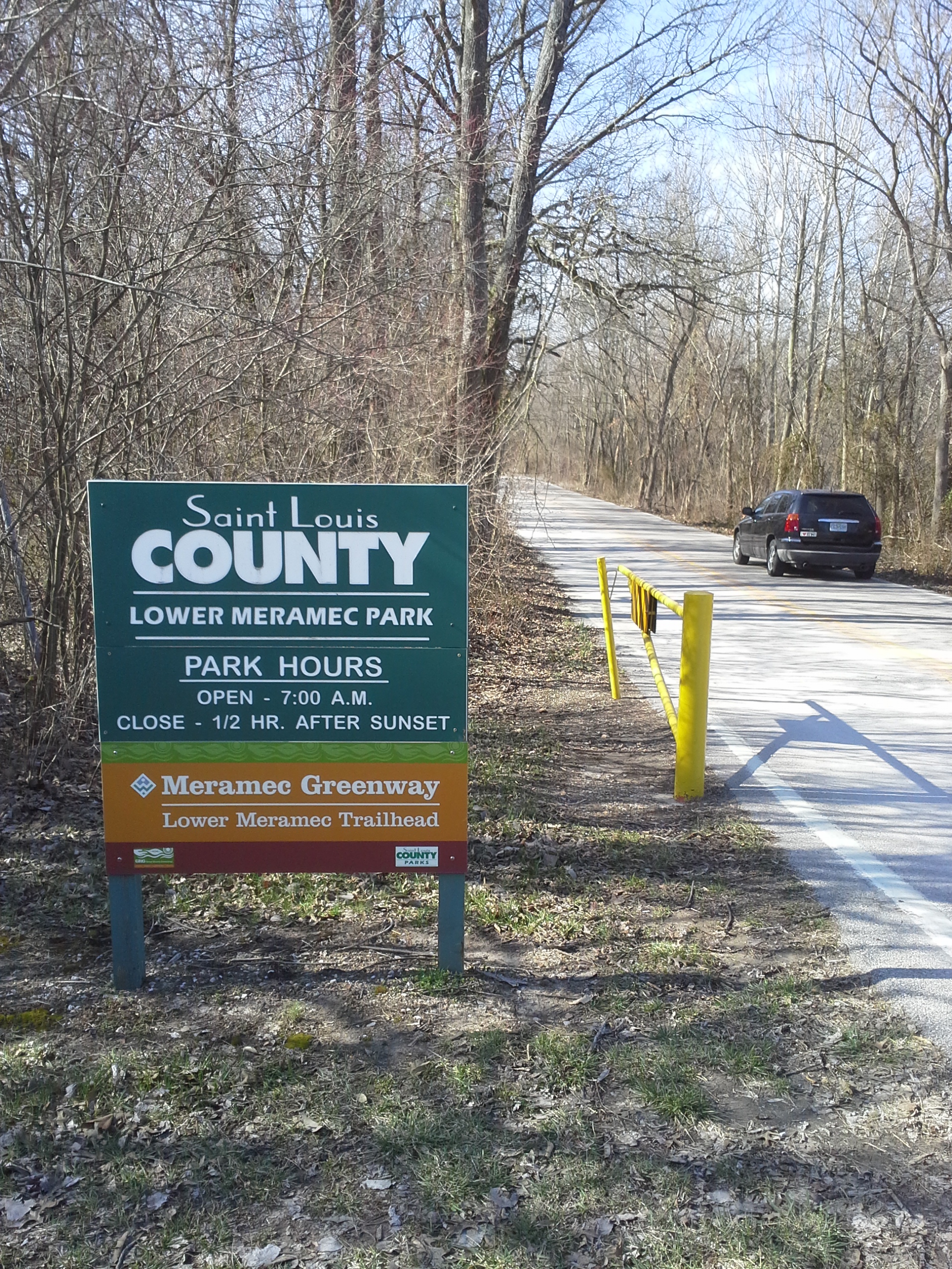 From 55 and 270, take 55 south toward Arnold. The last exit before the river is Meramec Bottom Road. Get off the highway here and make a right. Almost immediately on your left is the first parking lot and trail head. If you continue down Meramec Bottom Road, past the farm and soccer fields, you will come to Holzers Park Drive on your left. This is the road to the second parking lot and the trail head on the other end. I usually park at this one because it is closer to the Tall Timbers trail.
