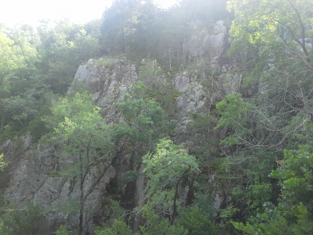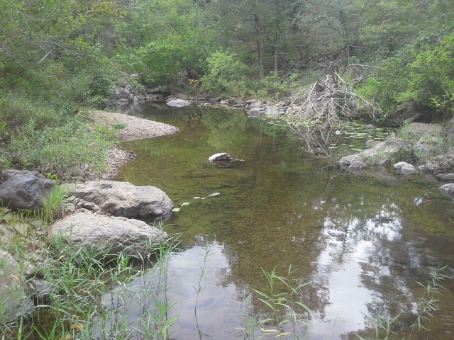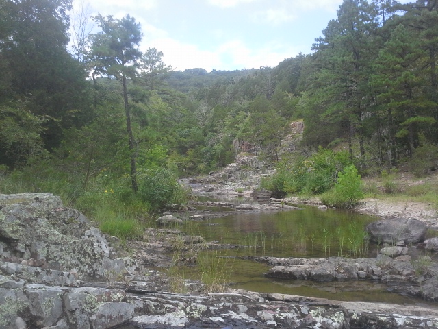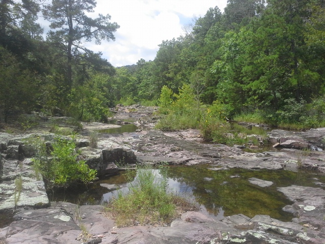 2014-08-09 12.31.38There is a place that I have reviewed before, but hadn’t been back to since around the time that I started this blog, a year and a half ago. It is one of the most gorgeous and wild and beautiful places in Missouri, as far as I am concerned, and it really isn’t too far away (at least for me). It is a natural place where I feel a definite connection to the wilderness while I am in it. A place that lends itself to inspiring that rugged fantasy of living in the woods, finding a harmonic balance with the plants and animals dwelling there, and making my home and life in the topography of the sharp peaks and rock filled waterways. A place where for miles of surrounding trees and hills, the only human sound is the one made by the occasional jet flying way overhead. Welcome to Lower Rock Creek, flowing through Cathedral Canyon, below the scenic glades of Trackler Mountain.