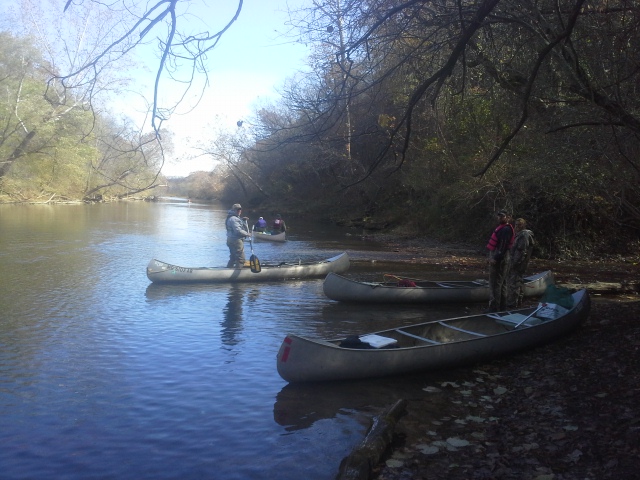 So we don our hats and gloves and extra jackets and waders and rubber boots, and we put off from Riverview Access and head down the Meramec. The air is cold, with the bright sun low in the sky, angling a deficient warmth through the undressing trees on our right side. It is one of those mornings where the air has a bite, and the sunlight is misleading. But the water is clear and the wind is weak, and we have the entire river to ourselves. This isolation is a rare thing in my experience as I am usually floating only on some of the warmer Saturdays when all the other recreationists are there too…but summer is over…so says the thermometer.