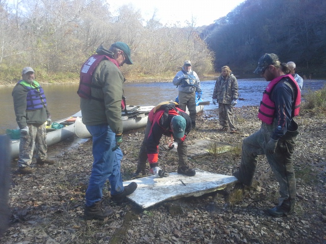 We all head to the boat ramp and start to unload the canoes and gear. It is a small band of river advocates on this frosty morning, and we are patiently eager to get to the adventure before us, with a cautious consideration of the lack of warmth in the air. Jay, Fred, Ken, Christine, Bernie, Brian, and myself, along with Mike who is to be our shuttle ride. The trip today is from Riverview Access downstream to Bird’s Nest Access. An estimated eight miles (if I remember correctly), according to our fearless leaders. We plan on picking up garbage that we find along the way, but the main target over all others is an old convenience store ICE chest that has been sitting abandoned in the Zahorsky Woods Nature Preserve for the past fifteen years. With the help of some dedicated people from The Nature Conservancy, and of course Bernie and his mean reciprocating saw, the ICE chest is stacked in pieces on the river bank, waiting for our canoes to arrive to float it out, as an actual road to its location is non existent.