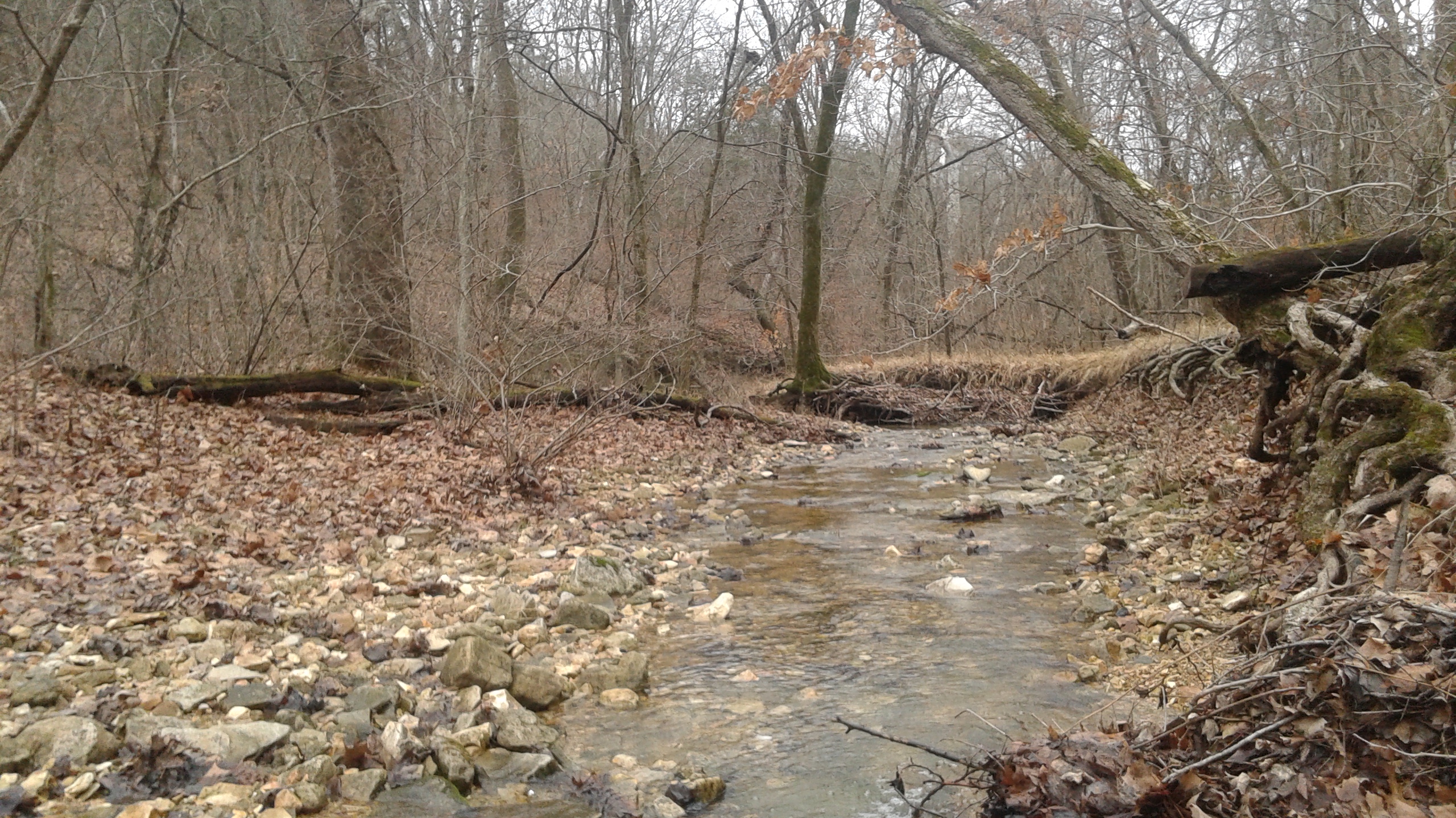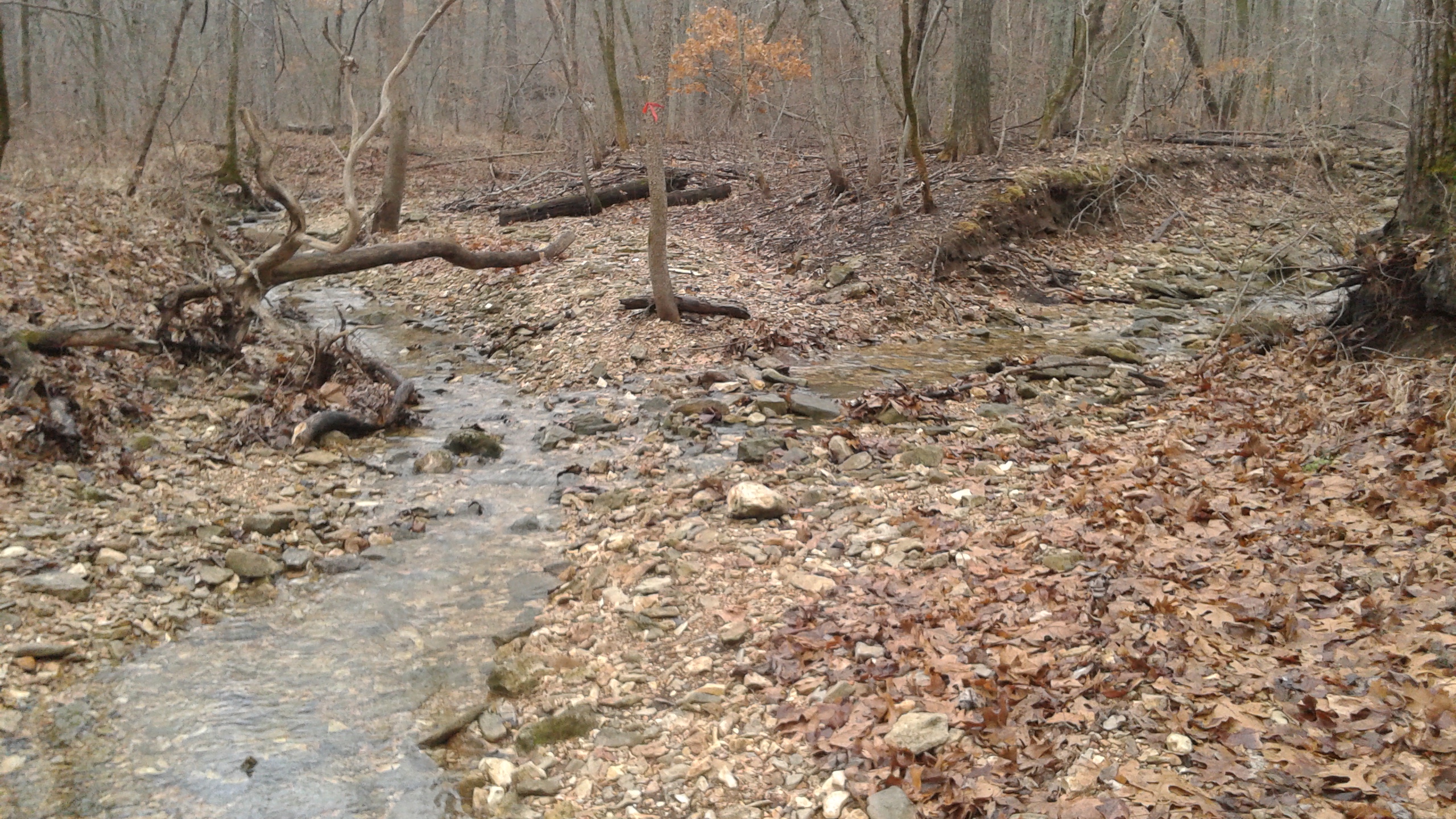 2014-12-24 10.37.14From this parking lot, there are a couple of trail options. One trail heads down the hill from the parking lot past a little fishing pond to LaBarque Creek and then loops around and meets up with the main trail. That main trail leaves from the northwest end of the parking lot and parallels FF back the way you came for about a quarter of a mile. It then turns left, dips, and comes up a slight rise. It then meets up with an access road that goes down the hill toward LaBarque Creek where it crosses the only bridge in the area. It passes through a field on the other side of the bridge, and then curves toward the creek. It takes you up along the side of a hill, passing next to a forest restoration area while moving away from LaBarque Creek. Then down the hill into a bottomland forest where you follow a little tributary that feeds out of the hills.