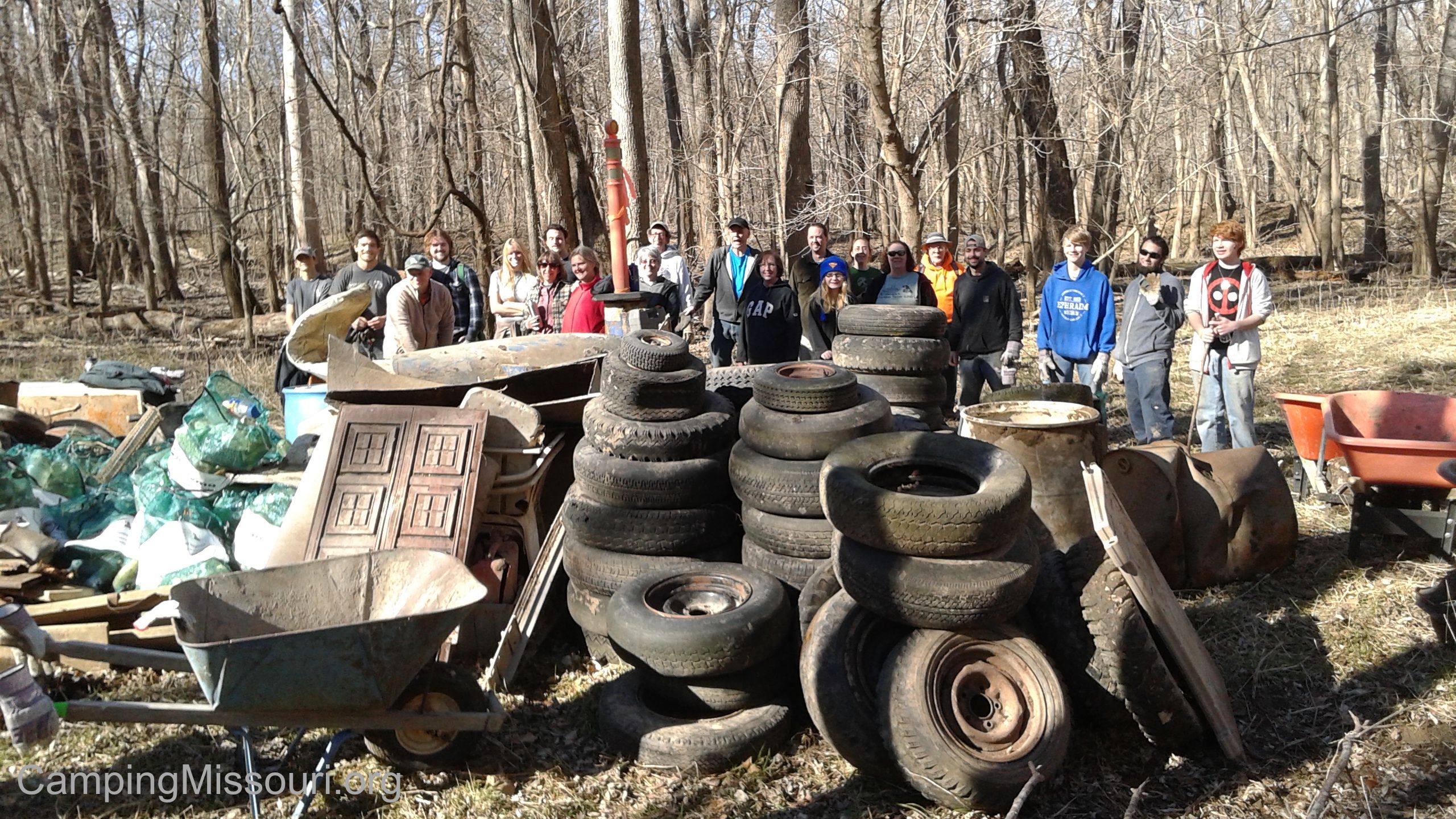 And it all started out so harmlessly. A group of 25 or so eager volunteers met at the Adlyne Freund Center, on the east side of SNR. It was about 9 am, with the sun just above the hills in the distance, burning off the cool mist rising from the river valley. It was looking to be a really warm day for January, and our plan was to hike just less than a mile down toward the Meramec River, and start gathering all the garbage and debris that had come to rest in the floodplain along it. We would collect it in bags, pile up the tires and random other things, and then use wheelbarrows to bring it all to a central location, which the SNR staff would eventually collect on a day when the mud was frozen enough to drive trucks on.