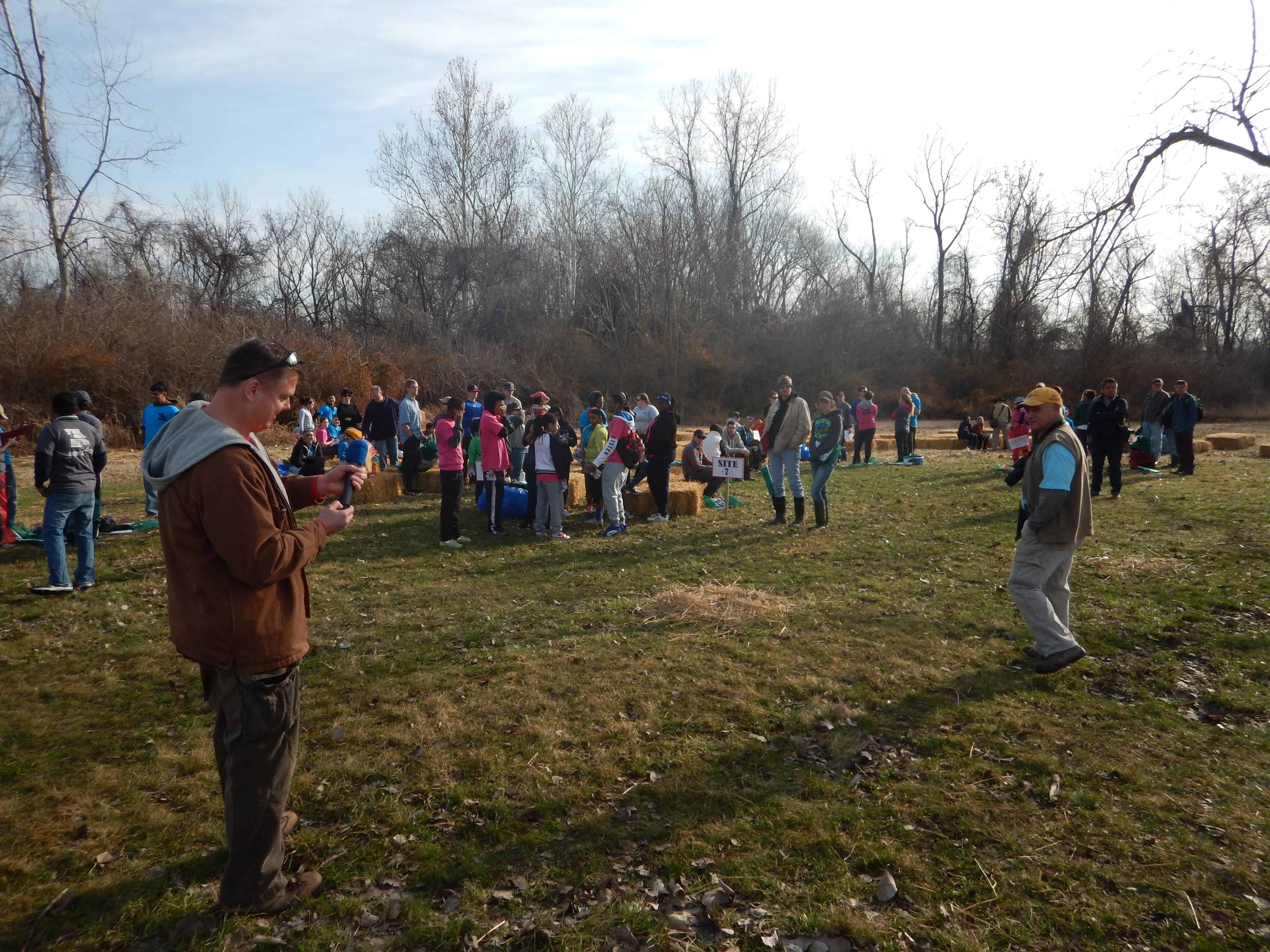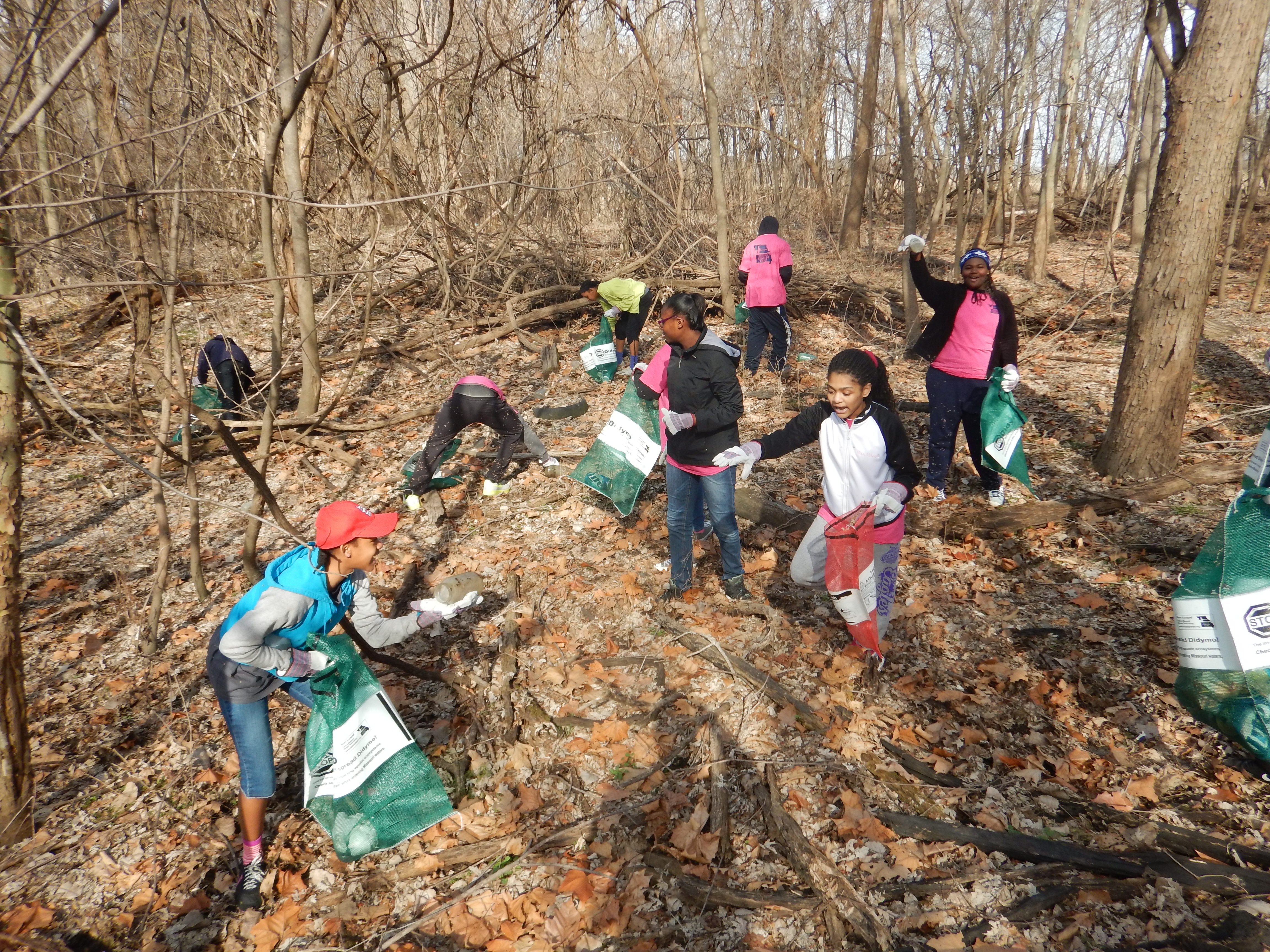 I have to confess, I must be lucky because I think I got the prettiest site of the day. As the team leader for site #5, I got to lead my group across a vast farm field in the southern section of Columbia Bottom Conservation Area to a compact forested length of floodplain that was the home to scattered garbage brought in by past floods. As we walked south along the access road, we followed it where it turned to the west, continued onward, and then entered the treeline once we finally found the main drag of marooned litter and debris. It wasn’t a very big site; just a strip of forest about a quarter mile long and with a welcome openness between the trees, except for the spots where great cottonwoods had fallen and opened up the canopy to trees of less stature and the vines that like to drape over them. The volunteers I had with me consisted of a handful of adults and an energetic group of kids from the Hazelwood School District, along with my own son Eli, who was trying out some new muck boots today. Everyone made quick work of the place, moving over the diminutive leaf covered knolls that were shaped and molded by the movement of past flood water piling the sand and organic matter among the base of great trunks, ultimately polished flatter by the winds that blow across the expanses of this conservation area after the summer months have caused the water to retreat to its established river home.
