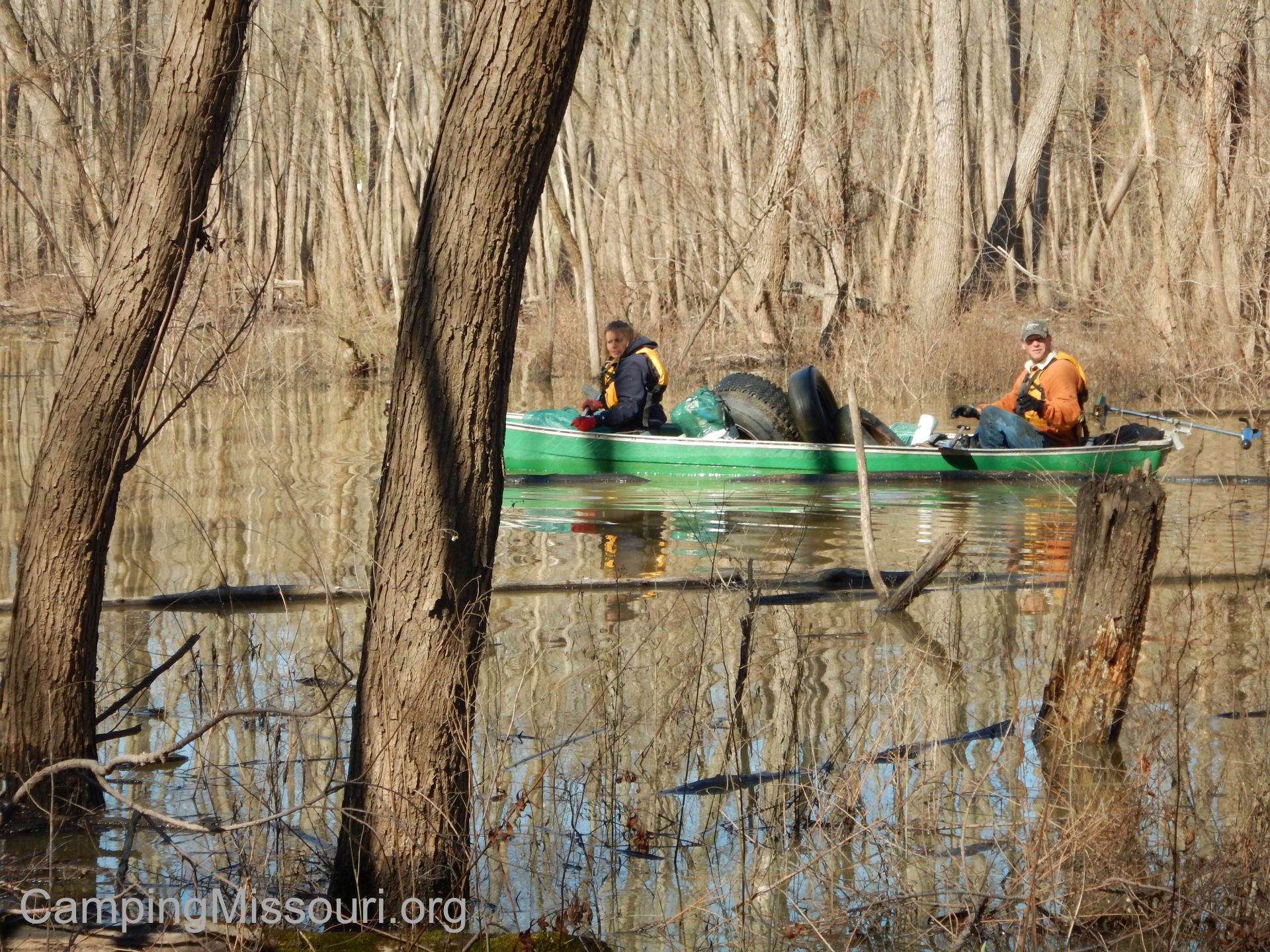This year we were going to tackle the expanse of land along the Mississippi River itself, so after meeting at Jefferson Square Park at 5th Street and Beckett for some donuts and signing in, with a speech about the objectives of the day from Kim, we loaded up our bags and gloves and headed east toward the river. After a short drive through this pretty little town and under the bridge on the far side, we parked in an open field and walked toward the flood plain. Now the area we were cleaning up today is called Chesley Island, part of the riverfront of Kimmswick. It is a strip of acreage with the Mississippi River as its eastern boundary, and bordered by a wide slough on its western edge. We moved north into the woods and began to scour the leaf litter for garbage. There was quite a bit of area, so we all spread out along a rough path, some cleaning along the river front and some of us cleaning along the edge of the slough. A group of Stream Teamers had also put canoes and kayaks into the water in the slough, and were going after some of the more stranded and unreachable tires and garbage.