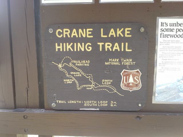 The Crane Lake Trail consists of two loops. The northern loop is about three miles, and goes right around the lake. The south loop is at the southern end of the lake, via the north loop, and adds two miles to your hike if you want to make it a five mile hike. The east side of these loops also shares about two miles its path with the Marble Creek Section of the Ozark Trail, which goes from Crane Lake to the Marble Creek campground.