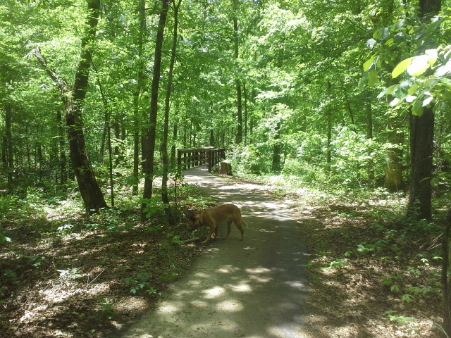 Keep your dog on a leash. The Missouri State Park policy states that ALL dogs must be leashed…but sometimes I let Max have special privileges when nobody else is around. I do NOT let him off the leash here though, as there are always people and bikes and dogs around.